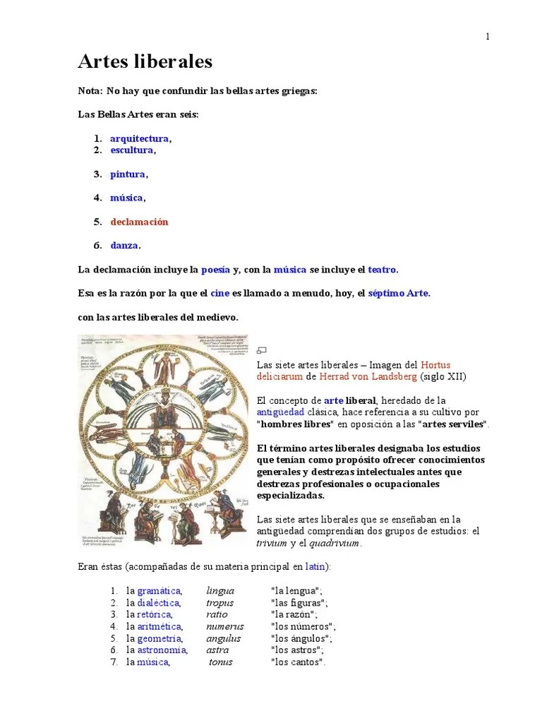 En la época antigua se distinguía entre las artes liberales, que sirven al hombre libre para encontrar el camino de la elevación del ser a través de la ciencia y el conocimiento; Y las artes serviles, son las que sirven para ganar su sustento y, por lo tanto, sólo tienen un fin económico. El uso de estas artes en las escuelas monásticas y catedralicias de la alta edad media. La expresión artes liberales, usada principalmente durante la edad media, no significa artes en el sentido en el que entendemos estas palabras hoy en día, sino aquellas ramas del conocimiento que fueron enseñadas en las escuelas de aquel tiempo. 20.05.2019 · las 7 artes liberales archivado en maestro; El término artes liberales designaba los estudios que tenían como propósito ofrecer conocimientos generales y destrezas intelectuales antes que destrezas profesionales u ocupacionales.